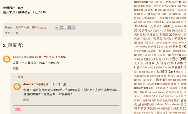 我愿意叫他方旗,因为这个名字本身方圆格致、振旗扬声的好含义;他的诗歌在香港早早发刊,奠定新派影响。在台湾,几个流派都需要诠释时代精神的时候,方旗的诗歌回归到诗学本身,带出来西方社会和东方乡土的感触,给几位最核心的诗人指出了方向——形式和诗学是根本,然后是谋篇布局,情感调度——东西方文化的诗学都产生于对商籁体的觉醒认识(西班牙语系除外……)。