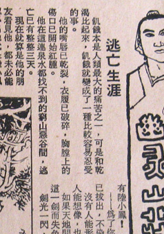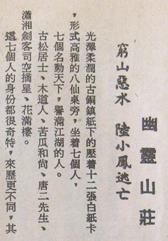 2、笔者翻阅手头数期明报,发现明报皆为新式标题,而且所用数量颇多(应该是报纸连载的关系,每期一个标题)。比如《银钩赌坊》中的“新娘子是个死人”,《幽灵山庄》中的“逃亡生涯”等等。而武功本(武侠与历史)则是多用老式回目(仅限前六册),如《银钩赌坊》中的“飞来艳福,美人投怀抱”,《幽灵山庄》中的“穷山恶水,陆小凤逃亡”等等。