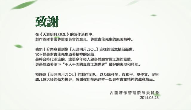 在此前古龙著作管理发展委员会授权过非常多的电影电视剧,在网络游戏的深度合作还是比较少的,非常高兴能和腾讯游戏、北极光工作室合作,感谢制作出一部如此高质量的作品。