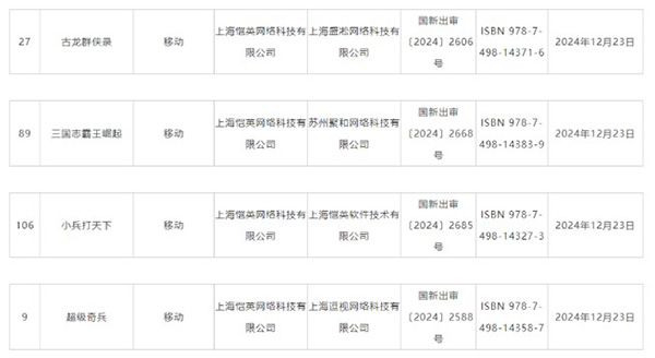 12月24日,国家新闻出版署官方公示了2024年12月份国产网络游戏审批信息,共有122款游戏获批。由上海恺英网络(002517)科技有限公司出版,上海盛凇网络科技有限公司运营的《古龙群侠录》,苏州聚和网络科技有限公司运营的《三国志霸王崛起》,上海恺英软件技术有限公司运营的《小兵打天下》,以及上海逗视网络科技有限公司运营的《超级奇兵》均顺利取得12月国产网络游戏版号。