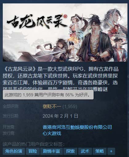 近日,由著名国产武侠单机工作室河洛游戏打造的最新作《古龙风云录》正式发售,引来了大量老玩家的关注。可让人意外的是,这一次河洛新作并没有取得预期效果,Steam好评率目前仅为56%,创河洛史上最低。