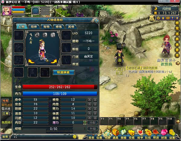 界面音效:创建角色界面一段委婉动听的音乐好似在向我们倾述江湖里说不清、道不明的恩怨情仇,让我沉浸其中,来回听了好几遍,当然我是一个音乐细胞并不过敏的人,这里就不多说了。进入游戏界面清晰明了让人一目了然,新老玩家一看基本就会操作了,游戏画面算不上华丽但也颇为精致,更难道的是透露着浓浓的武侠风味,很符合游戏的背景,这里个人对喜爱武侠的玩家推荐下。